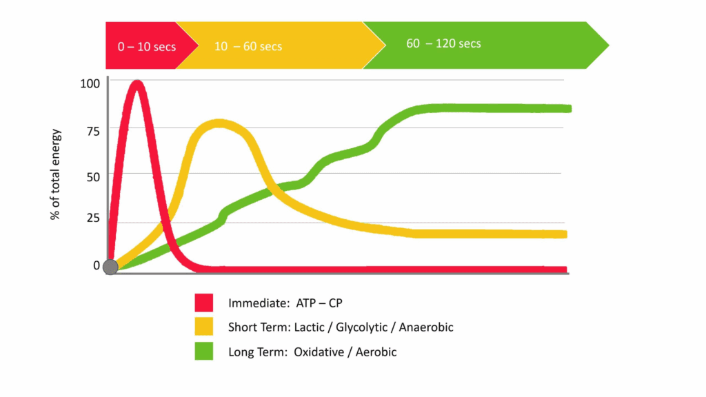 Laten we eens duiken in de theorie van conditionering: energiesystemen. Je lichaam gebruikt de energie die is opgeslagen in ATP om cellulaire processen aan te drijven. Je lichaam heeft drie energiesystemen die je activiteit ondersteunen, afhankelijk van intensiteit en duur: