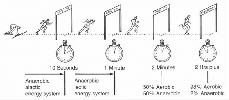 Hier is nog een vereenvoudigd voorbeeld van hoe de energiesystemen zich verhouden tot intensiteit en duur. Stel, je vrienden komen onverwacht naar je huis voor een feestje. Ze hebben geen eten of drinken meegenomen. Wat doe je dan? Eerst serveer je ze wat je in je koelkast hebt staan - snel en bij de hand, want het is al in huis. Het raakt snel op omdat je voorraad beperkt is. Dat is je anaerobe alactische systeem, waarvan creatine al aanwezig is in je spieren om meteen te gebruiken en de prestaties zijn op hoge intensiteit en kort. Als je koelkast leeg is, is het feest voorbij. Of je moet boodschappen gaan halen...